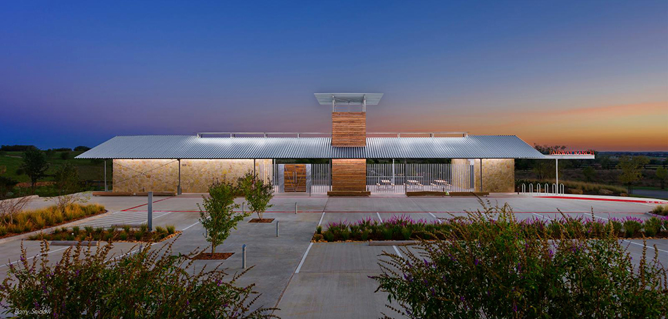 Fairway Ranch, DSGN, Roanoke (3,040 square feet): This amenity center is located at Fairway Ranch, a residential subdivision in Roanoke, Texas. The center is situated at the primary entrance to the subdivision, and its simple, barn-inspired form is intended to remind residents and visitors of the rural heritage of the ranch. Located on a rocky knoll, the un-air-conditioned center is oriented along an east-west axis for optimal shade and to capture prevailing southern breezes. Both center and pool deck are sited for optimal views to ponds and hills to the north. A shaded observation tower provides additional viewing opportunities.![]()