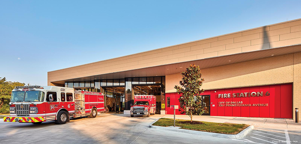 Fire Station No. 6, DSGN, Dallas (12,158 square feet): Fire Station No. 6’s neighborhood was divided in the 1960s by the construction of a freeway, now being converted to S. M. Wright Boulevard. The station is intended to be a major component of the city’s efforts to undo the damage done by the freeway, taking advantage of the area’s proximity to downtown, low land, and housing costs, as well as a powerful existing sense of community. Fire Station No. 6 is based on the city’s standard kit-of-parts, but the generous size of the site allowed an unusual opportunity, the provision of drive-through apparatus bays, and related functional advantages. ![]()