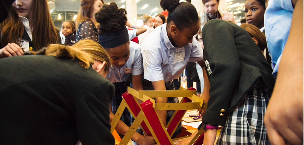 Students piece together their bridges from duct tape, cardboard, string, rubber bands, and wooden dowel rods. [Photo: JerSean Golatt/Perot Museum of Nature and Science]