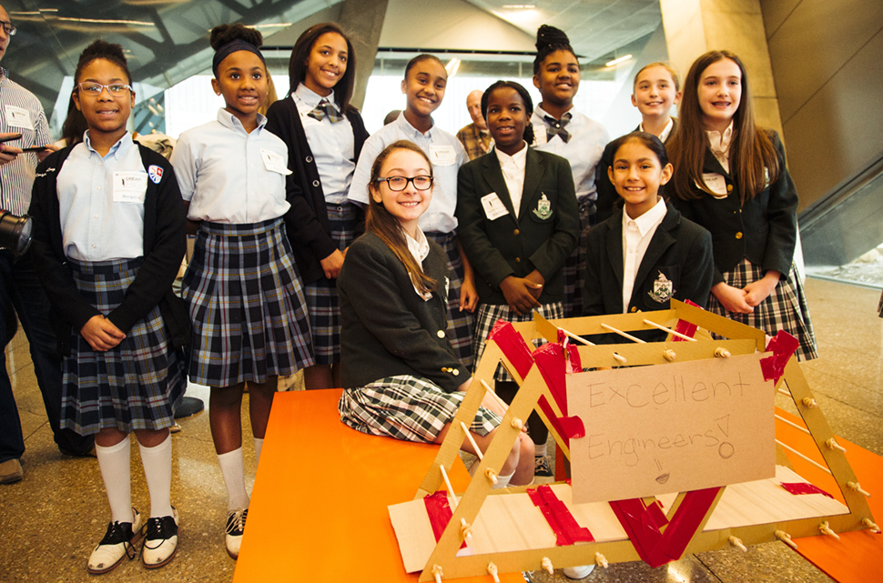 For the past 15 minutes, fourth-, fifth-, and sixth-graders from Dallas-based the Hockaday School and St. Philip’s School and Community Center had collaborated to construct a freestanding bridge. Ten students from each school were mixed together to form two teams — The Excellent Engineers and The Four Es.