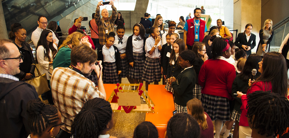 People snap photographs of The Excellent Engineers’ bridge. [Photo: JerSean Golatt/Perot Museum of Nature and Science]