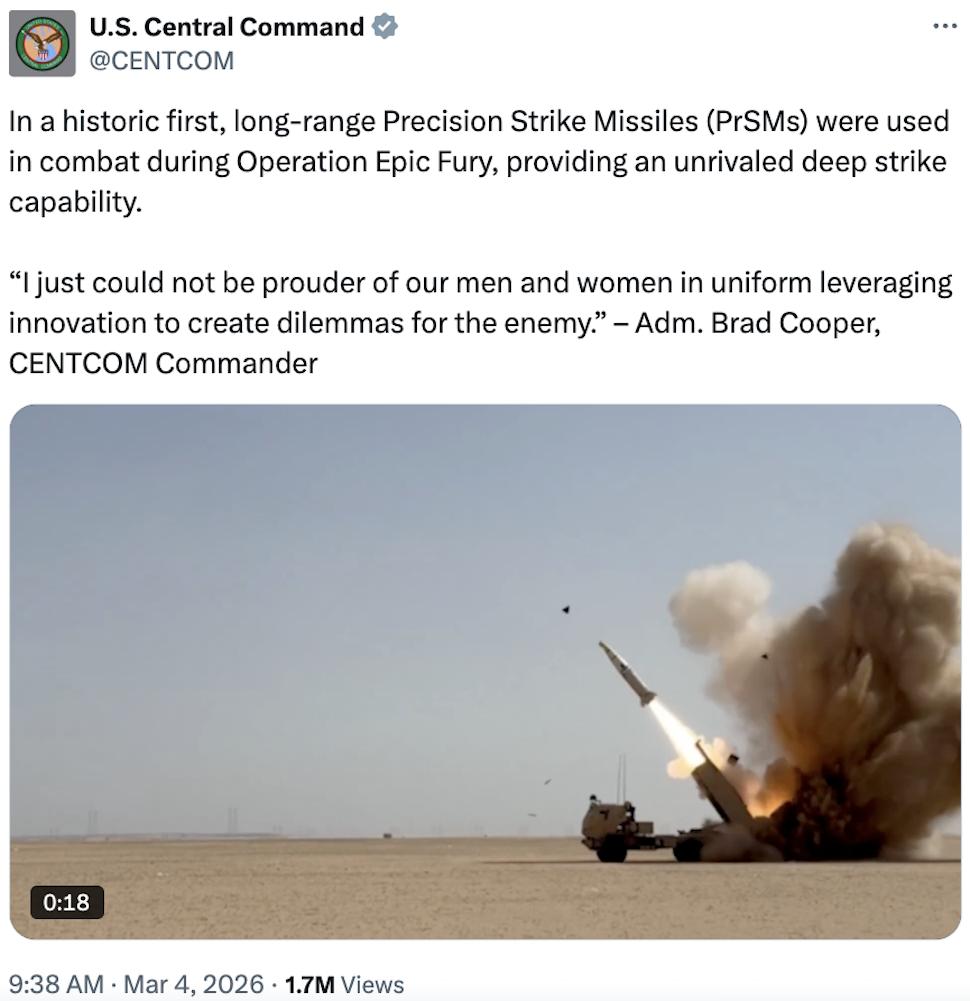 Amid the U.S. military’s ongoing Operation Epic Fury in Iran, Lockheed Martin (NYSE: LMT) has announced that its North Texas-based Missiles and Fire Control division is quadrupling its production of Precision Strike Missiles (PrSM). The missiles—designed by Lockheed to replace the aging ATACMS platform—got their first-ever combat use in the war’s opening days, according to a post by the U.S. Central Command which shows a PrSM being launched.