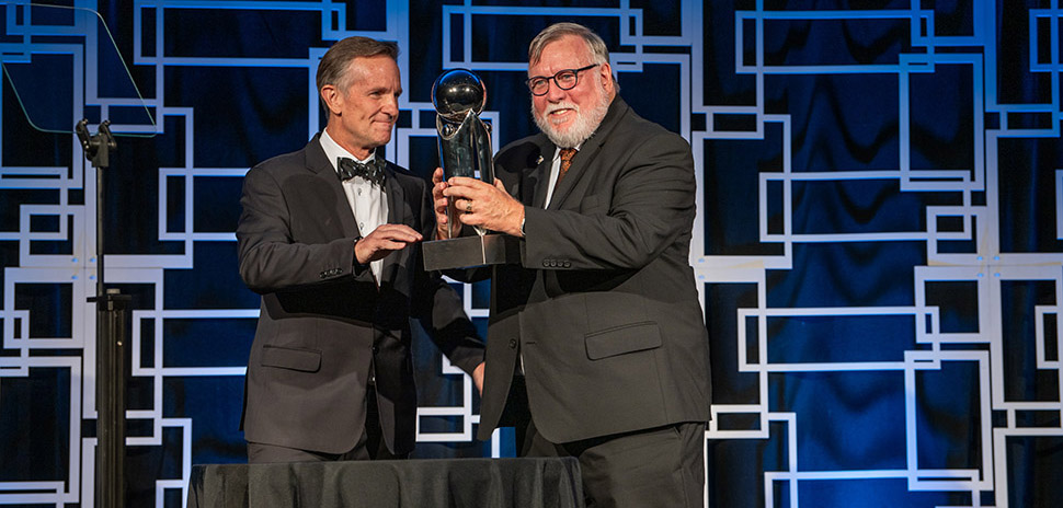 Tech Titans Hall of Fame inductee Dr. Richard Benson, retired president of UT Dallas, accepts his award from Stuart Sides of BGSF Professional [Photo: RD Images]