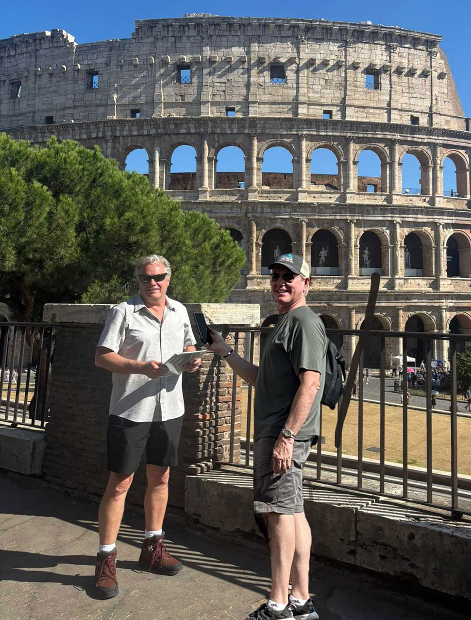 Histoury co-founders Todd Porter, left, and Kelly Hoerner at the Colosseum, the startup’s first commercial site for Portyl, an immersive AR app that reanimates ancient history with CGI. [Photo: Histoury]
