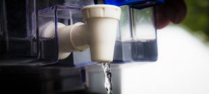 The humid air goes through a condenser that cools it back down until it reaches liquid form. At this point, it’s distilled water.