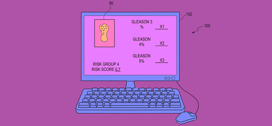 Alphabet spinoff Verily Life Sciences, based in Dallas, has received a patent for a method that uses artificial intelligence to predict prostate cancer outcomes. The approach involves applying an AI Gleason grading model to prostate tissue images, determining the relative proportions of Gleason patterns, and generating an automated risk score or risk group value. Figure 4 from the patent illustrates how an AI-generated risk group score could be presented on a clinician’s workstation. [Composite illustration: Sources, USPTO Patent #12444044, Fig. 4; DI Studio]