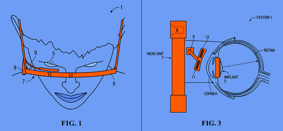An eye implant that projects laser images onto the retina is the concept behind a new patent from Dallas-based Verily Life Sciences. The system pairs an intraocular implant with a head-worn camera that captures and transmits scenes to the eye in real time. Dallas law firm Haynes and Boone prosecuted the patent. [Composite illustration: Sources, U.S. Patent No. 12529886, Fig. 1 and 3; DI Studio]