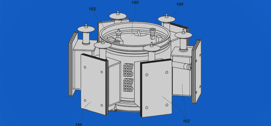 Northrop Grumman’s newly patented method for satellite servicing uses a pod secured to another spacecraft for deployment. Inventor James Dulin Reavill of Irving is credited on the patent, which outlines a system for transferring spacecraft servicing devices between orbits. [Image sources: USPTO Patent #12358655, Fig. 2L; DI Studio composite image.]