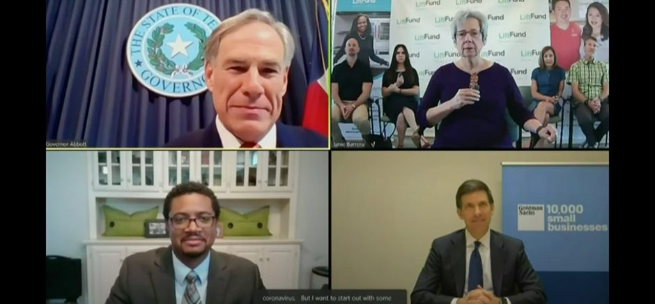 Texas Governor Greg Abbott announced in a videoconference that Goldman Sachs will be providing $50 million in loans to small businesses through the SBA's paycheck protection program.