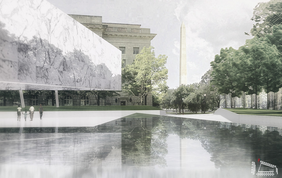 The western wall is designed to frame the view of the Washington Monument in the distance.