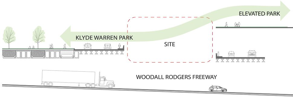 The 17,500-square-foot Klyde Warren Park Promenade is designed as a hybrid of path and place, with one condition supported by the other, according to the entry. A 300 foot long ramp, bending to fit the boundaries of the site, aims to be a transition between the existing street level park and the new elevated portion that plans to connect the Perot Museum of Nature and Science with Klyde Warren Park.