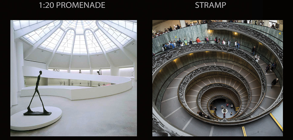 The Promenade (1:20), left, and the Stramp, right. The geometry of the curving ramp forms the plan of the Promenade Pavilion’s restaurant and workspace.