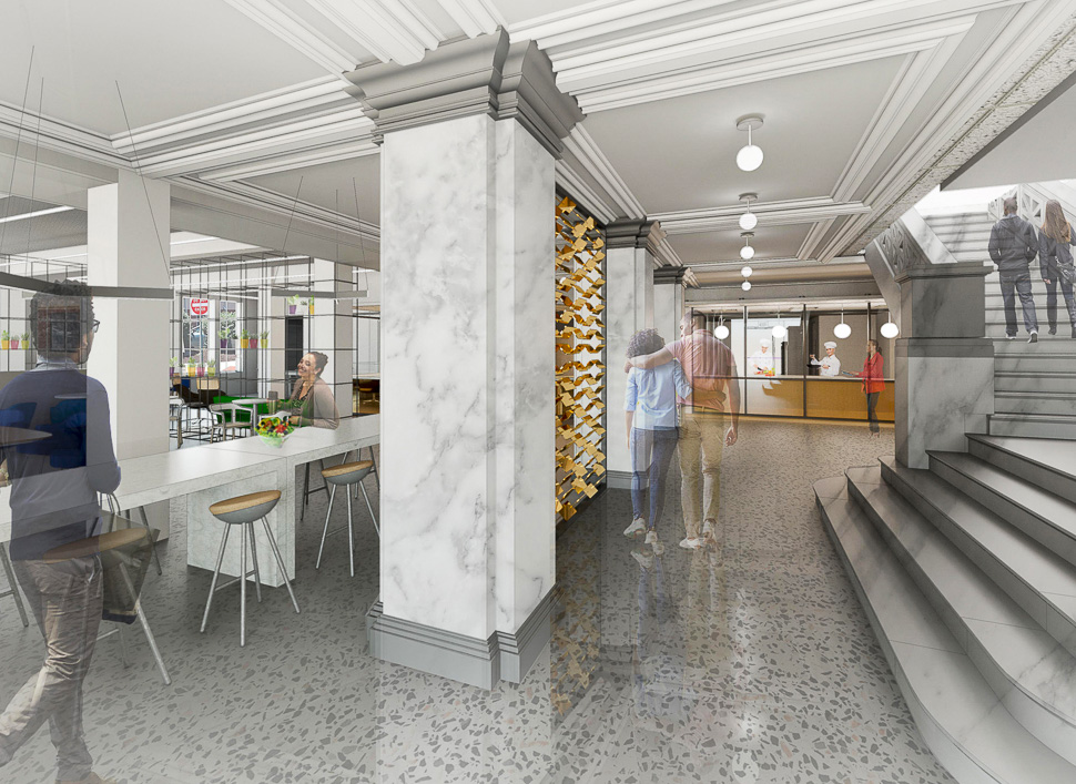 The building was restacked to consolidate most public services at ground level with a cafe open to the public to be located in a preserved historic courtroom, according to the entry.