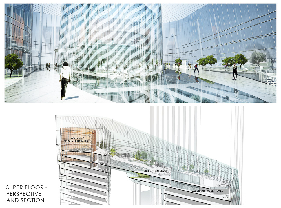 Perspective and section of the “Super Floor,” which includes a lecture/presentation hall and exhibition level.