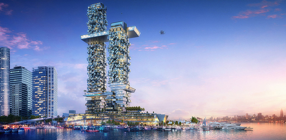 The architectural firm’s Vice President of Design Walter Hughes presented the forward-looking project at January’s 2018 International Builders’ Show in Orlando. The Pier 2 high-rise concept includes two residential towers on the Manhattan waterfront.