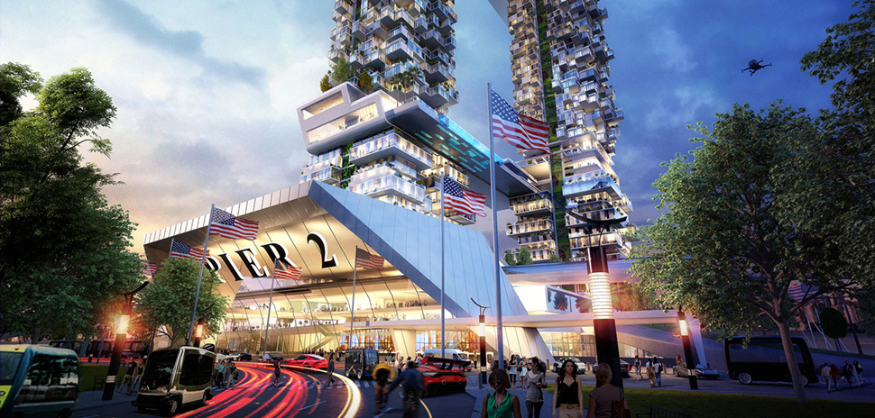 “Most of these solutions designed for Pier 2, will eventually percolate to a variety of building types and price levels, benefiting society as a whole. Conceptually, Pier 2 will have photovoltaic glass, wind turbines, and green walls allowing residents to grow their own food and clean the air they are breathing.”