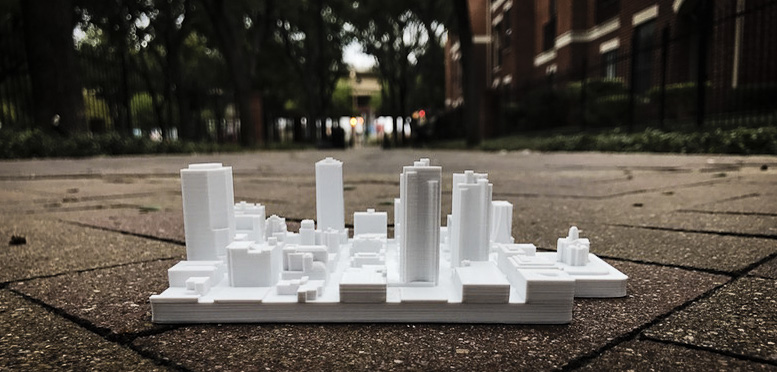 It took the 25-year-old SMU grad about 50 hours to make the skyline design on his computer. Each 2.25-inch-tall piece takes about 10 hours to print on his 3D printer.
