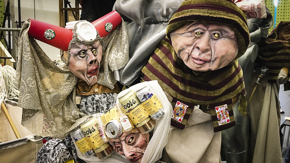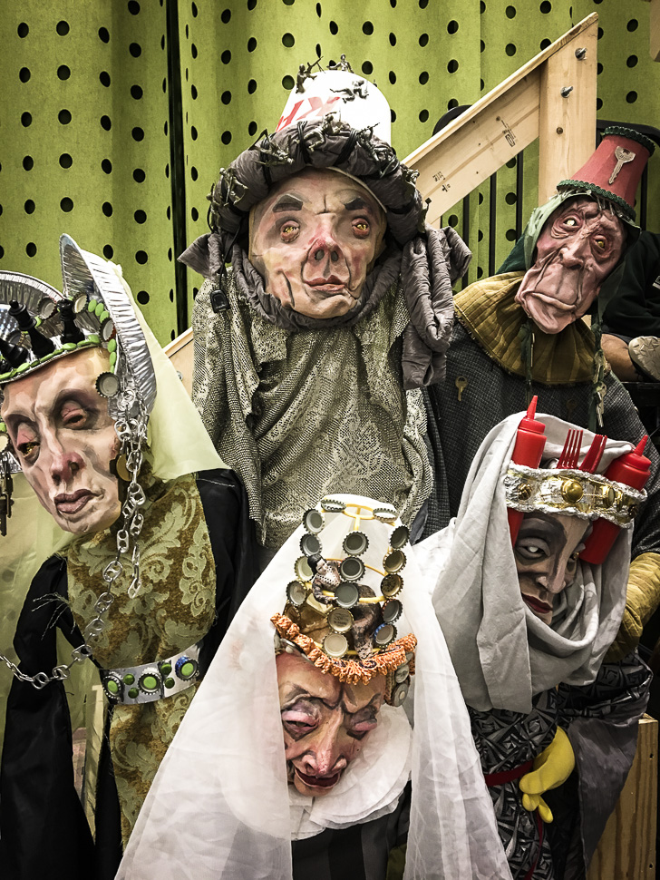 Hood puppets use coffee cups and beer cans for headpieces. [Photo: Karen Almond via DTC]