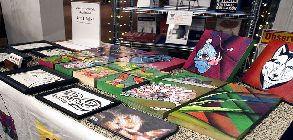 The visual artist featured at Dark Moon’s Birthday Celebration was Erica Guajardo. Guajardo had paintings on display around the bookstore, but she also had a table set up with work.