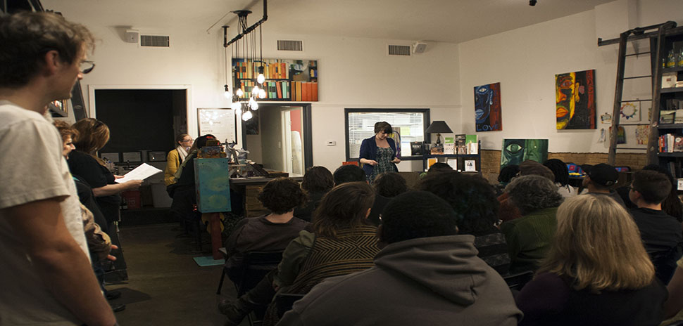 People gather for Dark Moon Poetry & Arts one-year anniversary event Sunday at Deep Vellum Books.