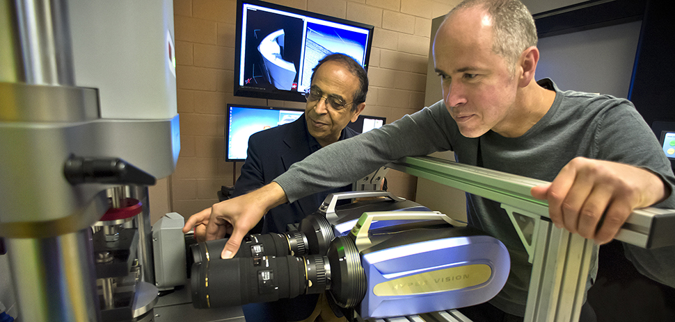 Erian Armanios, left, chair of the Department of Mechanical and Aerospace Engineering, watches Andrew Makeev at work. [Photo: University of Texas at Arlington]