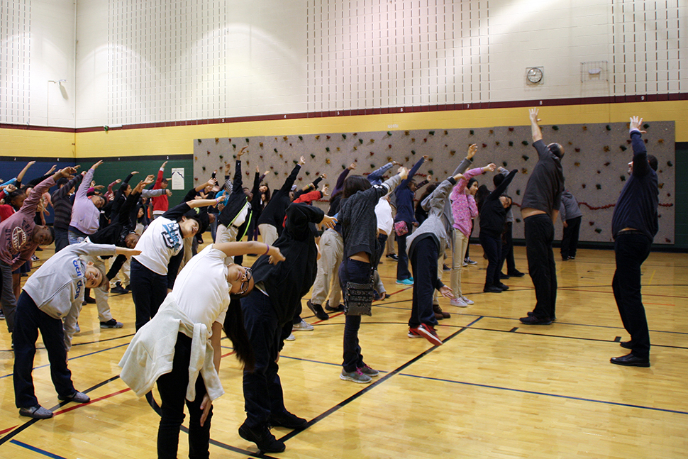 Brashear Elemetary fifth graders practice their warrior poses during the mindfulness yoga session.
