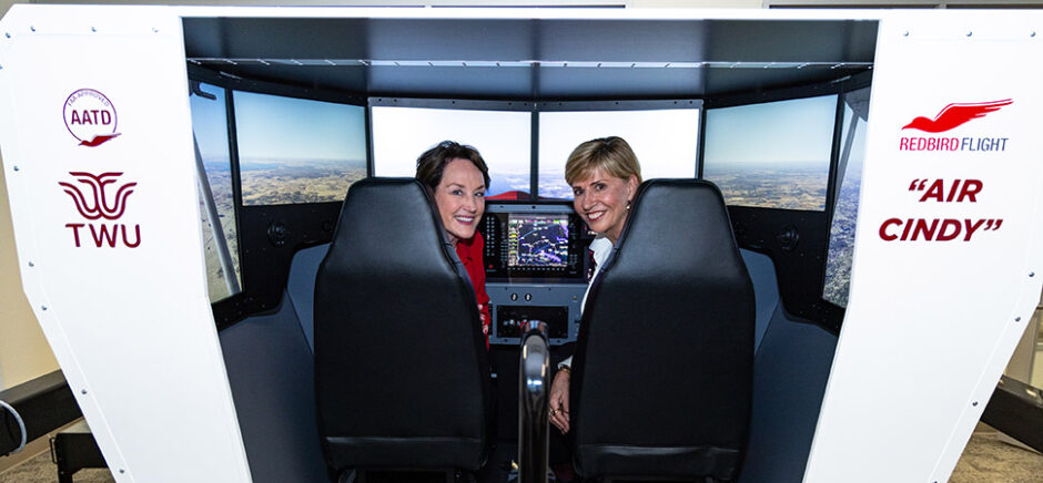 TWU alumna Cindy Weber (left) and Chancellor Carine M. Feyten in the Doswell School's new flight simulator, funded by Weber's family gift. [Photo: Texas Woman's University]