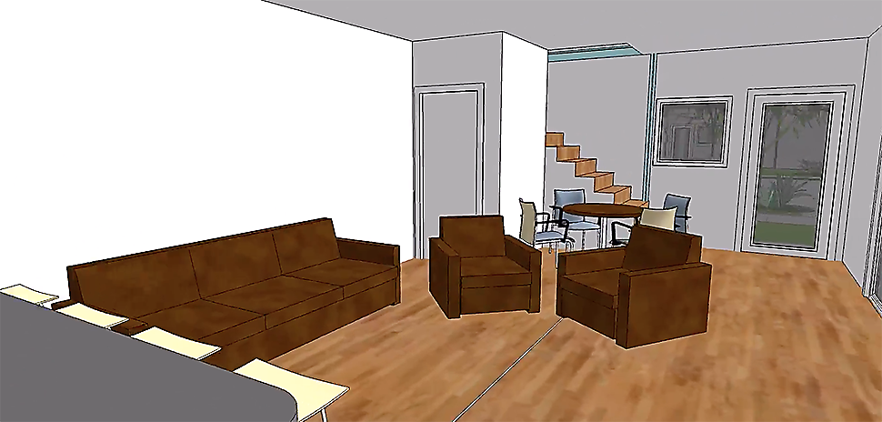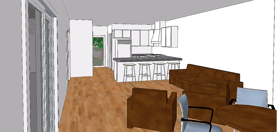 Kitchen and living area of a Cotton Groves dwelling.