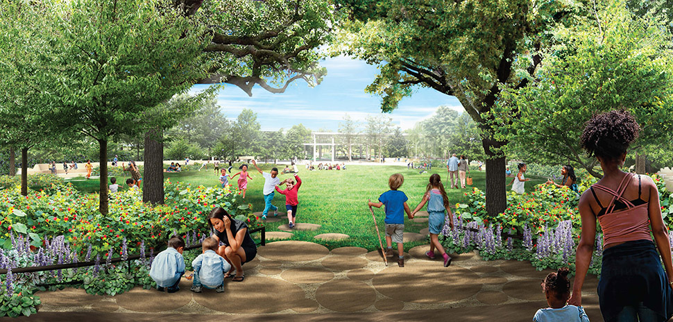 The $325 million park near downtown, which broke ground in April, will feature a 40,000-square-foot event lawn, an event center, a six-tower playground, a water play area, picnic groves, a skate and bike park, a cable ferry, and more.