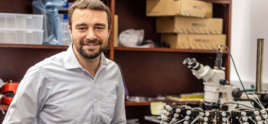 Joseph S. Friedman, who leads the NeuroSpinCompute Lab at UT Dallas, with the prototype neuromorphic computer designed to learn patterns using far fewer training computations than today’s AI systems.[Photo: UTD]