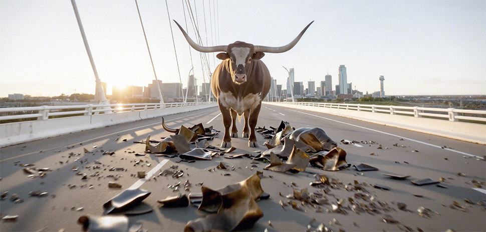 Imagine the famous bull statue on Wall Street coming to life and locking horns with a real Texas longhorn on Dallas’ Margaret Hunt Hill Bridge. The longhorn wins, shattering the bronze sculpture into hundreds of fragments. That’s the gist of a new TV spot promoting the Texas Stock Exchange, which bills itself as “the real bull market.”