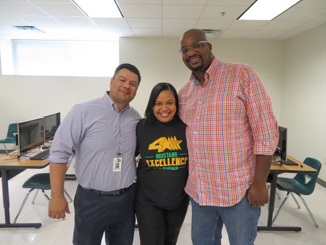 From left: Dallas ISD robotics coordinator Joseph Schelanko, Marsalis Elementary teacher Telisa Ingram, and Hack My Future founder and CEO Shawn Scott.