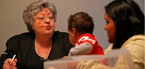 Suzanne Borman (left), a nurse in WiNGS’ Nurse Family Partnership program, works with a client. WiNGS is one of 12 Dallas nonprofits selected for the initial cohort of the Prime 5 Catalyst Program. [Photo courtesy of Stand Together]