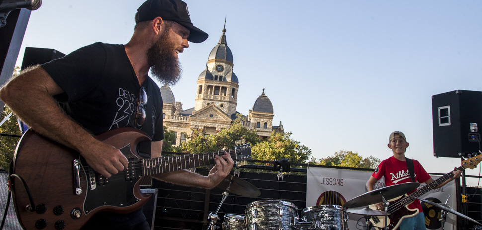 Erich Nicholson and son Tate Nicholson, 13, of the band Marathons and Unicorns perform at the Denton donation station during last year’s North Texas Giving Day. [Photo: David Leeson]