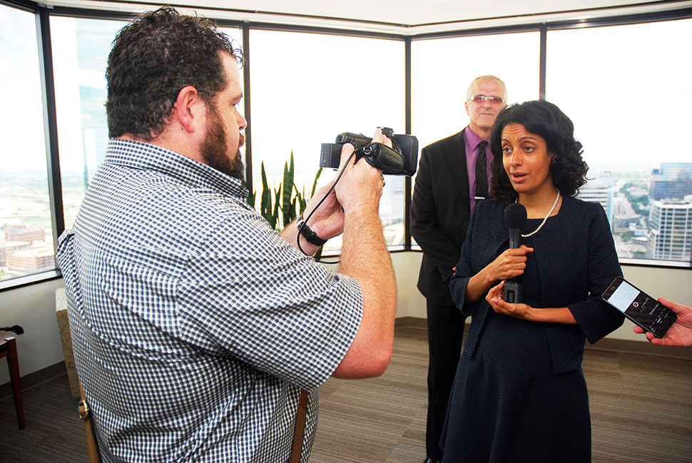 Canadian journalist Yanick Michaud interviews Quebec Minister Dominique Anglade in the Dallas Regional Chamber offices in downtown Dallas. (Photo by Lance Murray)
