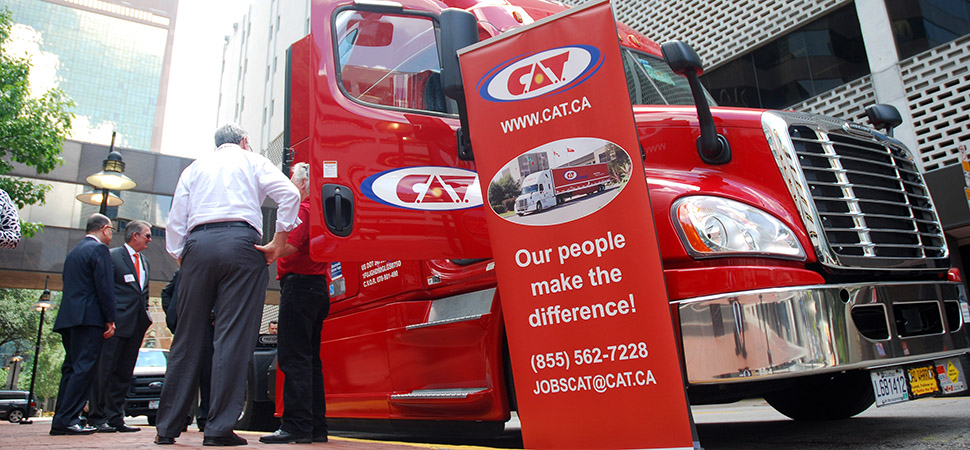 C.A.T. used the occasion to show off one of its new compressed natural gas-powered trucks, driven from Canada for the event held at the offices of the Dallas Regional Chamber in downtown Dallas.