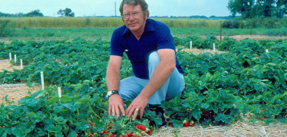 James Moore works in a strawberry field in 1979 at the University of Arkansas. [Photo courtesy of University of Arkansas]