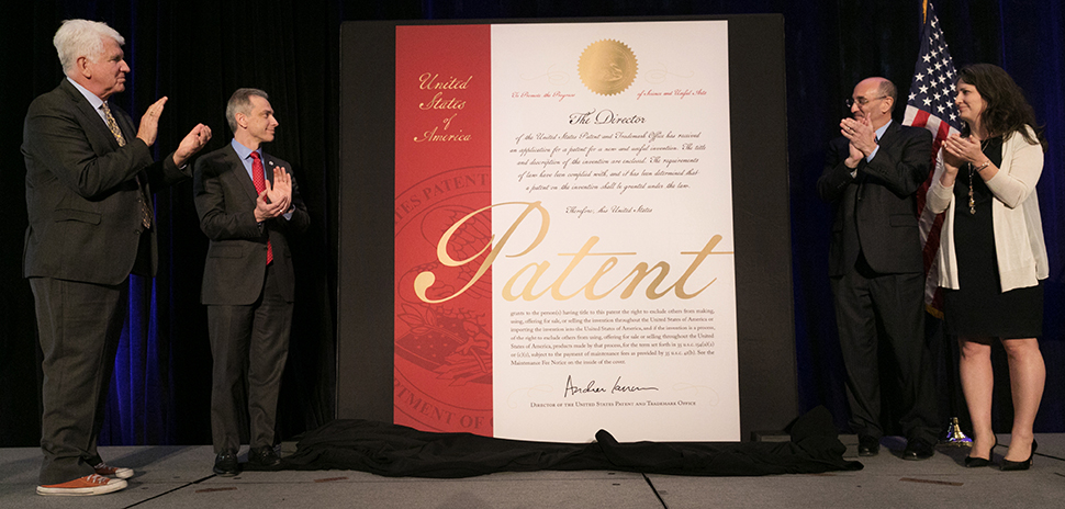 Pictured from left to right: Robert Metcalfe, inventor of Ethernet and a National Inventors Hall of Fame inductee; Andrei Iancu, under secretary of commerce for intellectual property and director of the USPTO; Drew Hirshfeld, USPTO commissioner for patents; and Susann Keohane, IBM master inventor and global research leader for the Aging Initiative, unveil the new design for U.S. patents. [Photo courtesy of Jay Premack/USPTO]