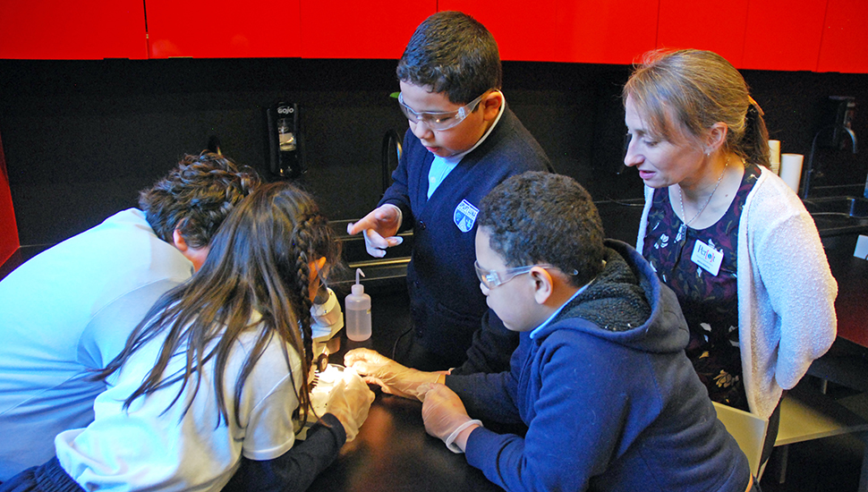 Perot Museum “Brainiac” Drew Montgomery (center) works with Uplift Luna students Daniel Sanchez, 10, Victoria Martinez, 10, Ethan Richards, 10, and Riley Waddill.