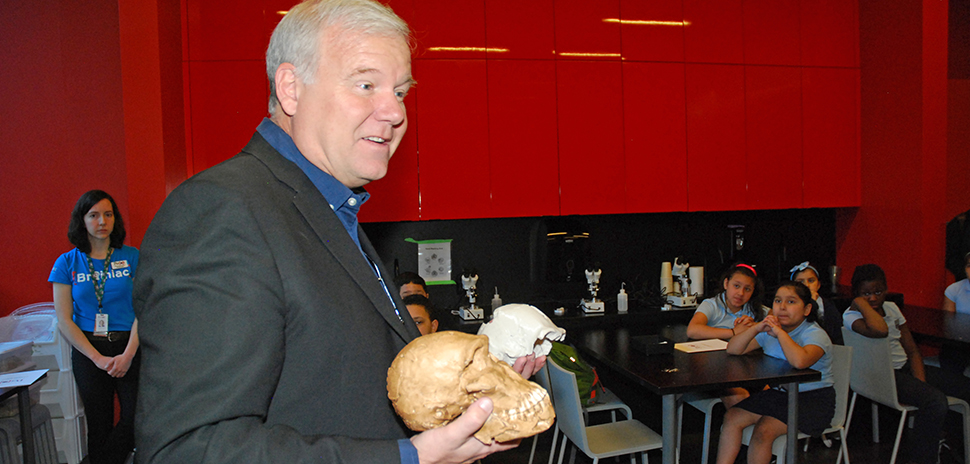 The formal announcement of the partnership is Monday night, but Berger visited the museum Monday morning and spent time with students from Uplift Luna Preparatory in a classroom at the museum talking about the discovery and showing off Neo, a skull from one of the Homo naledi specimens discovered at Rising Star.