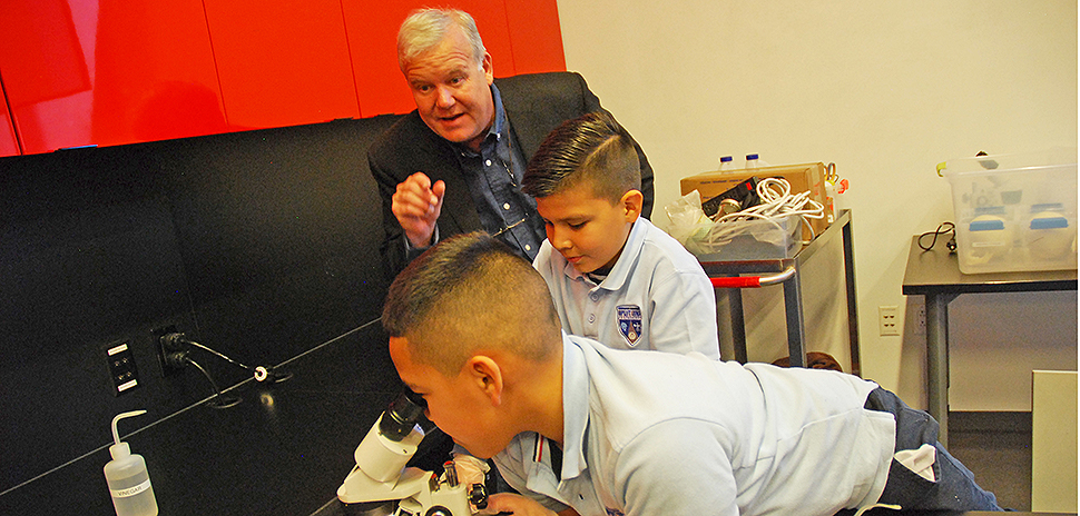 Berger instructs Uplift Luna Preparatory students Rafael Morales, 10, and John Zuniga, 10.
