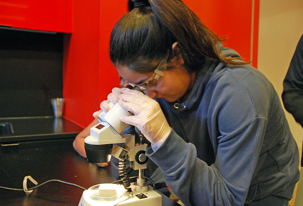 Alexa Cortez of the Uplift Luna Preparatory peers through a microscope at the Perot Museum.
