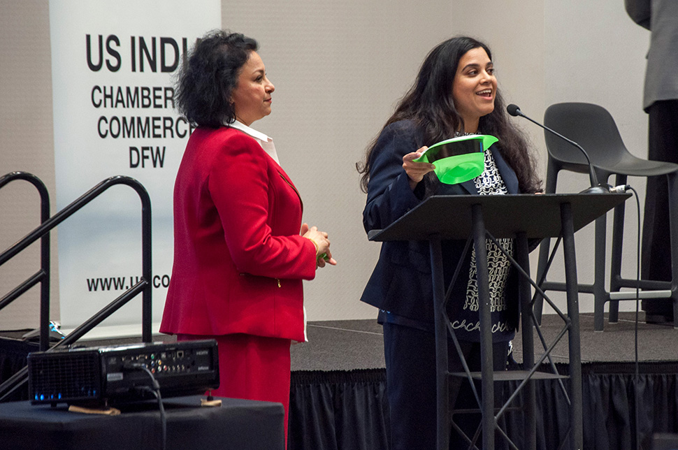 Neel Gonuguntla (right), president of US India Chamber of Commerce DFW, pulls a business card from a hat for a drawing.