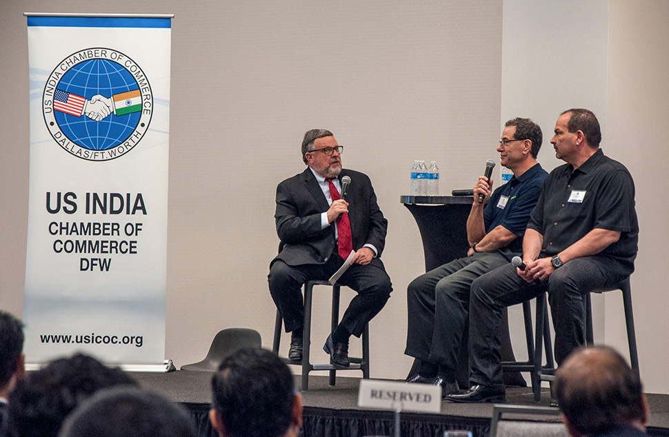 “The Billion Dollar Exit” panel at the 2017 Annual Technology Conference hosted by the US India Chamber of Commerce DFW, from left to right, moderator David Johnson, David Litman, CEO of Getaroom.com and founder of Hotels.com, and Lance Crosby, CEO of StackPath and founder of SoftLayer.