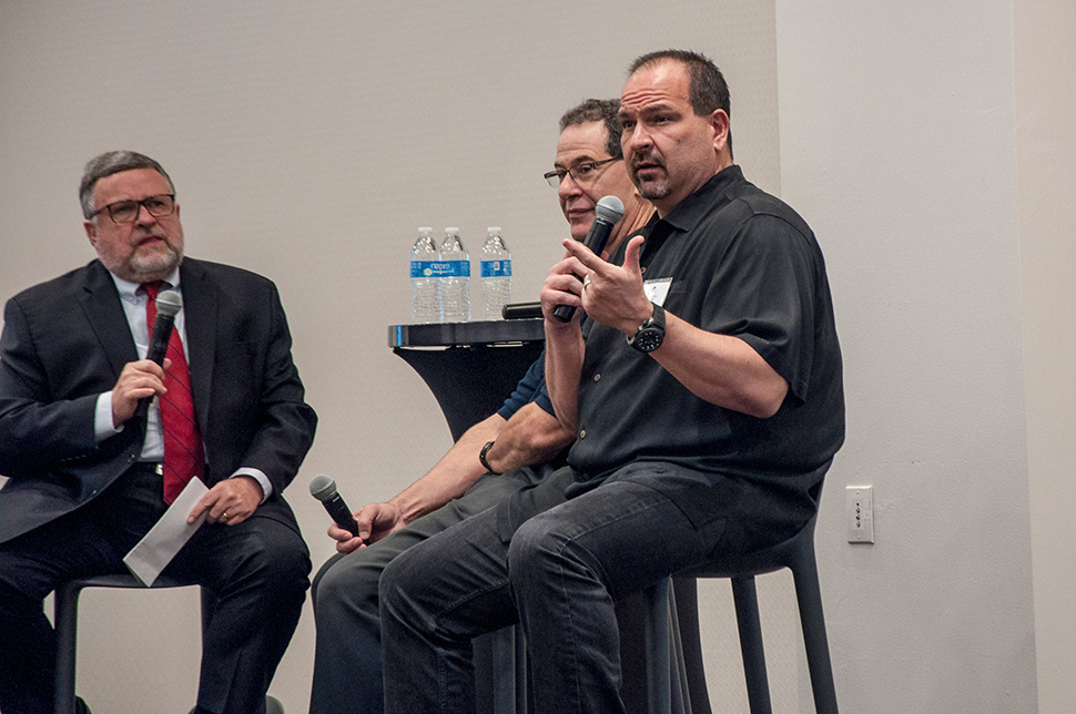 Ed Mello, moderator of the Inc. 500 CEO Panel at the 2017 Annual Technology Conference asks a question to the panelists.