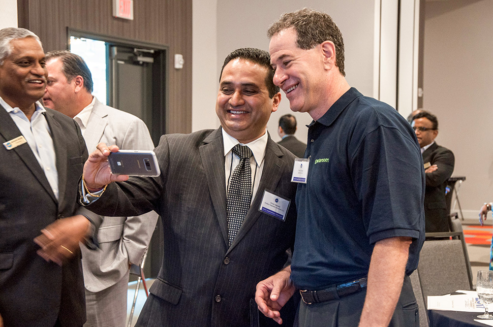 Conference attendee Vimal Kansara, Perfect Hospitality Solutions LLC, takes a selfie with David Litman, CEO of Getaroom.com and founder of Hotels.com, at the 2017 Annual Technology Conference.