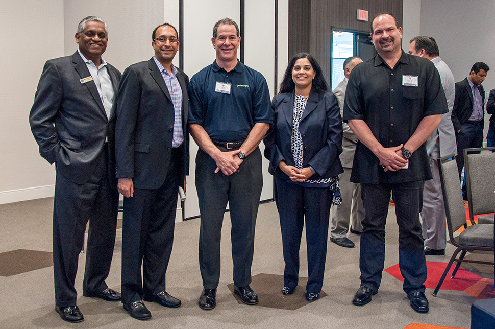 US India Chamber of Commerce members and “The Billion Dollar Exit” panelists stand for a group photo. From left to right, Mahesh Shetty, chairman, Vik Thapar, board member and technology conference chair, David Litman, CEO of Getaroom.com and founder of Hotels.com, Neel Gonuguntla, president, and Lance Crosby, CEO of StackPath and founder of SoftLayer.