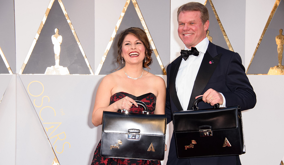 PwC partners Martha Ruiz and Brian Cullinan walk the Oscars red carpet carrying their briefcases loaded with envelopes bearing the names of Oscar winners. [Photo Courtesy PwC]