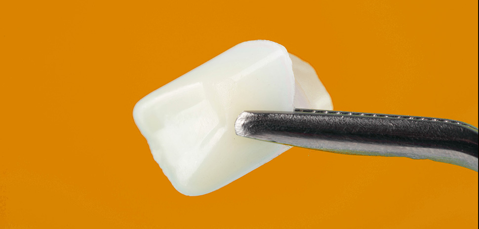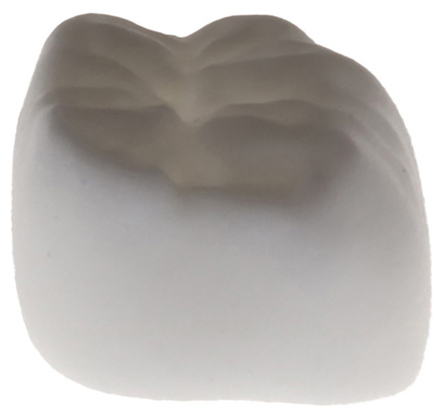 A finished dental crown produced using a 3-D printing method developed by UT Dallas researchers. [Photo: UTD]