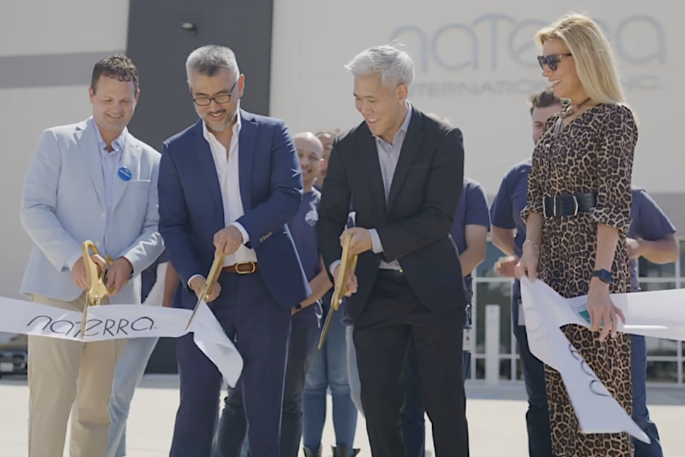 Peter Song and Jon Song, center, cut the ribbon on the new $120M Naterra facility in Fort Worth on September 26, 2025. [Video still: Wal-Mart]